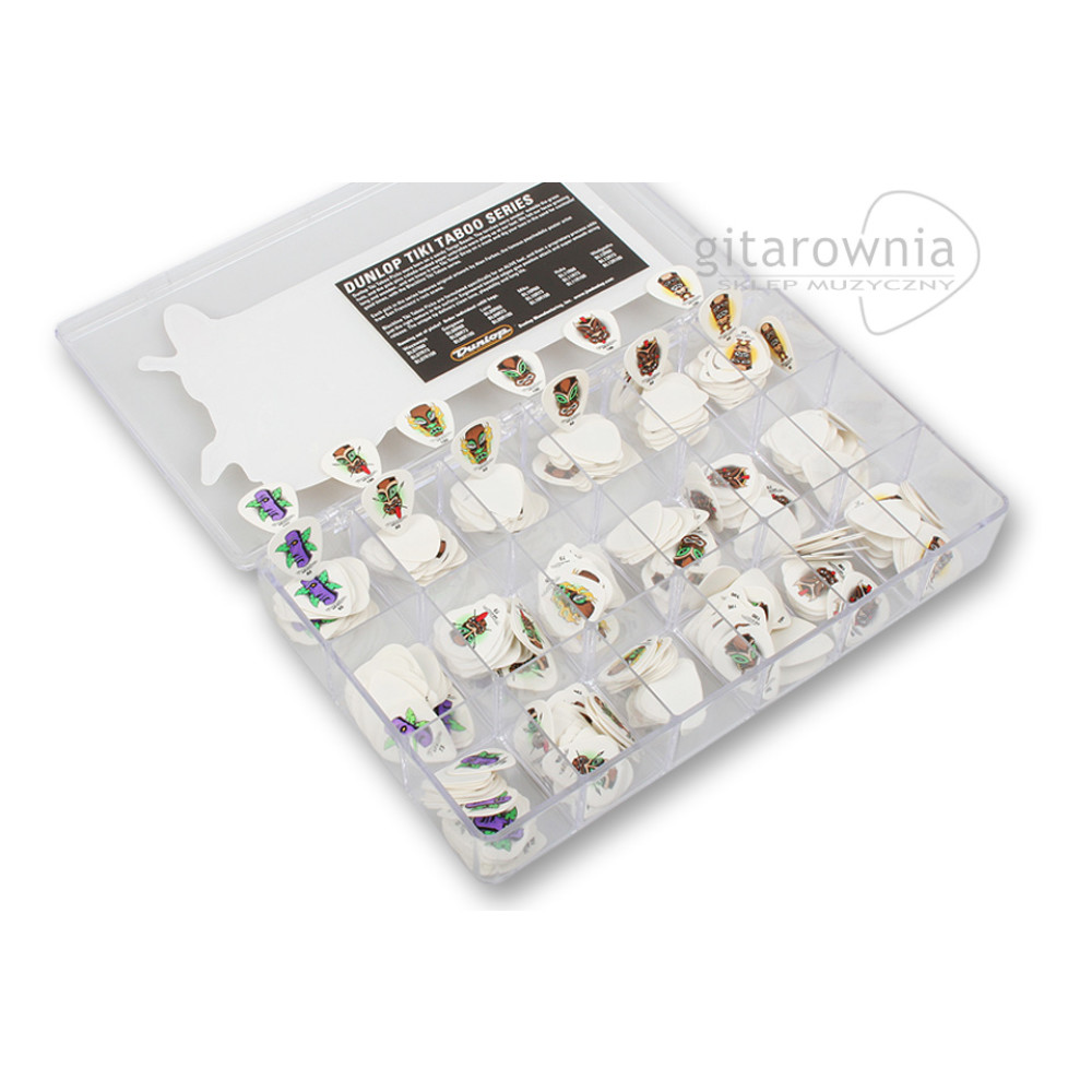 Caja con una selección de 432 púas Dunlop Blackline Tiki Taboo