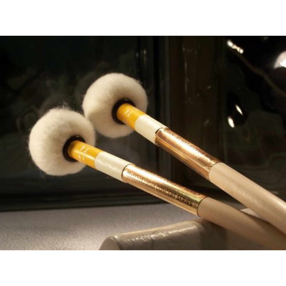 Cabeza de bola con el interior de madera y una capa de fieltro alemán. Es el otro modelo general de la serie, también muy vendido desde que fabricamos esta serie hace más de 15 años. No es muy duro, es un modelo muy general que puede utilizarse en infinidad de repertorio orquestal y en obras de estudio para estudiantes de nivel medio - superior. Versatilidad y una excepcional relación de calidad precio.