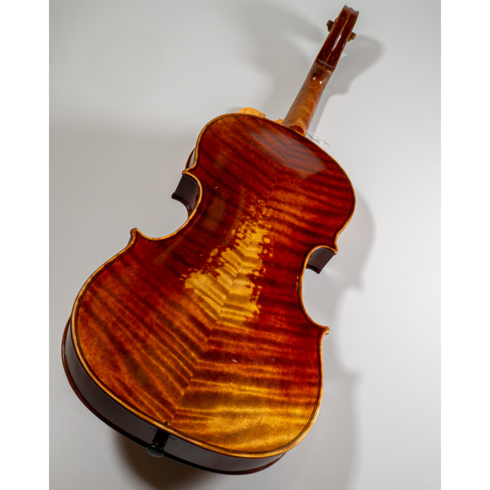 Violín 4/4 de fabricación artesanal con tapa de abeto y cuerpo y mástil de madera de arce veteado.