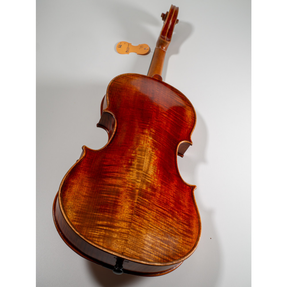 Violín de tamaño 4/4 de fabricación artesanal con tapa fabricada en madera de abeto. Fondo, aros y mástil en madera de arce veteado. Acabado de barniz antiguizado.
